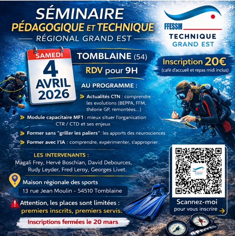 Les présentations du séminaire sont ici : https://ffessm67.fr/f/news/detail/presentations/1/Kqp7WifVFn85EaZYhWCxzsmaiUpLfec_wdizZ7m-OZA T. ANTHRajeunissement B. SCHITTLYParticularités physiologiques des jeunes, incidences en activité subaquatique M. LAMBINETVous avez dit « honorabilité » ? L. LEFÈVREFavoriser et maintenir l’engagement des jeunes : des obstacles aux facilitateurs V. HEIDT« Plongée Jeunes » exemples d’actions A. PONCHECompensez en douceur Adresse : 4 rue Kirchleger 67000 Strasbourg Programme […]